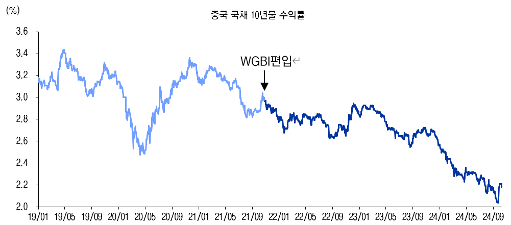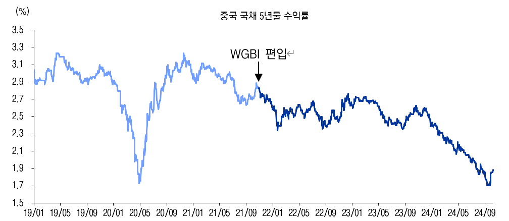 - 실제 지수 편입까지는 1년의 유예기간이 남았지만, 시장의 예상과 다른 조기 편입 확정에 따른 단기 자금 유입도 있을 것으로 보임. 앞서 2021년 WGBI에 편입된 중국은 편입 발표(2020.09.24) 이후 이틀간 5년물 국채 금리가 2.6% 내렸으며, 멕시코 5년물 금리는 4.8% 하락하며 ‘선언 효과’가 작용했다고 함.