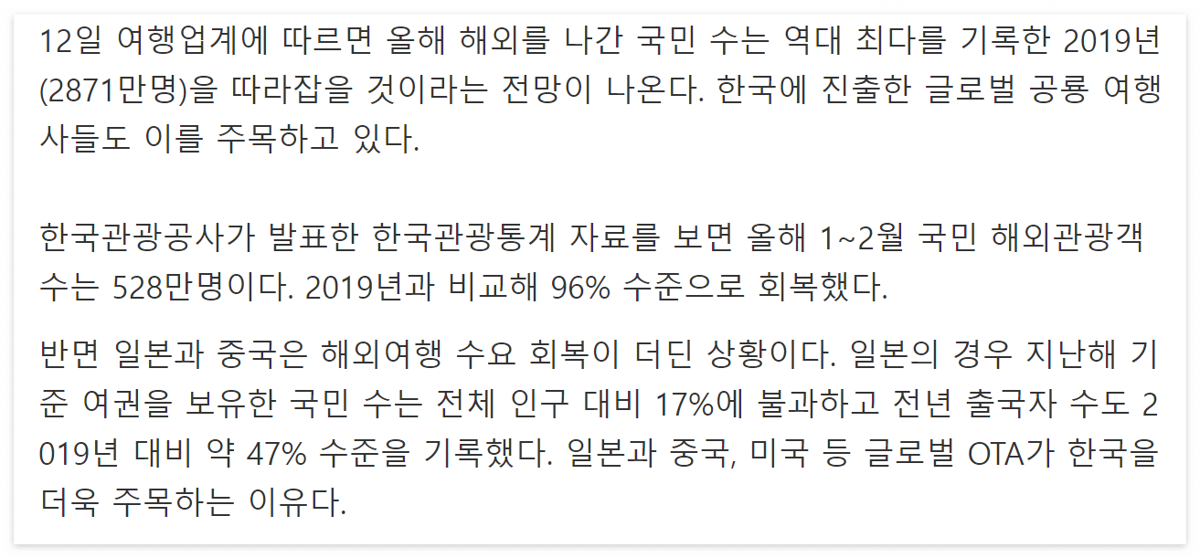 이제 코시국도 끝나고 여행 수요가 많이 회복되었다는 기사는 접한 것 같은데