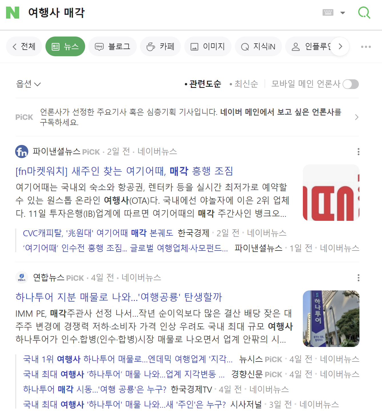 우선 매각 소식이 있던 선두 여행 기업들부터 한번 검색을 해본다.
