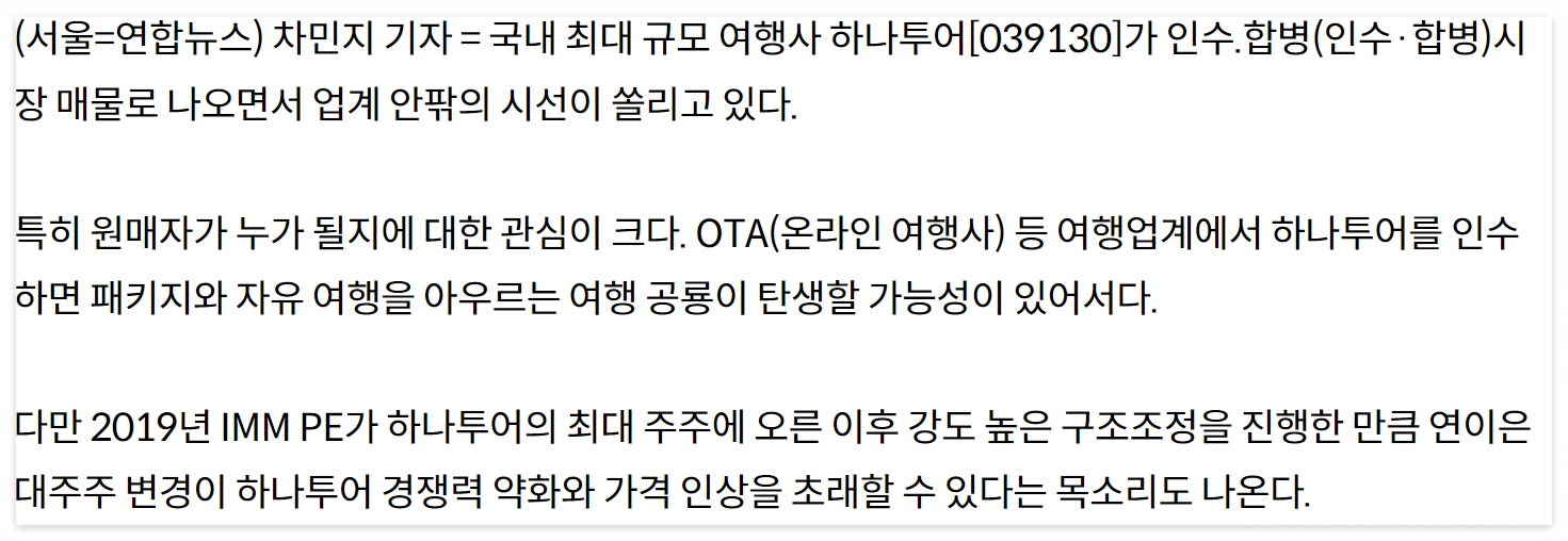아무튼 이러한 하나투어가 매물로 곧 나올 예정이라 어떤 업체가 눈독을 들일지 주목해볼 만한 상황인 것 같다.