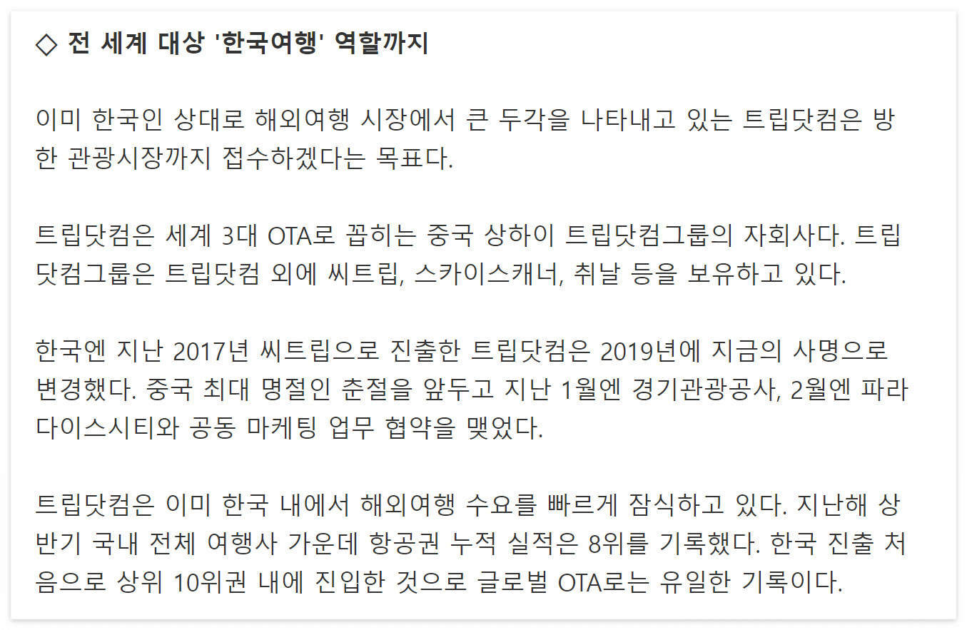 글로벌 주요 OTA 중 하나인 트립닷컴은 2017년에 한국 시장에 진출해 이미 국내 여행시장 수요를 잠식하고 있고