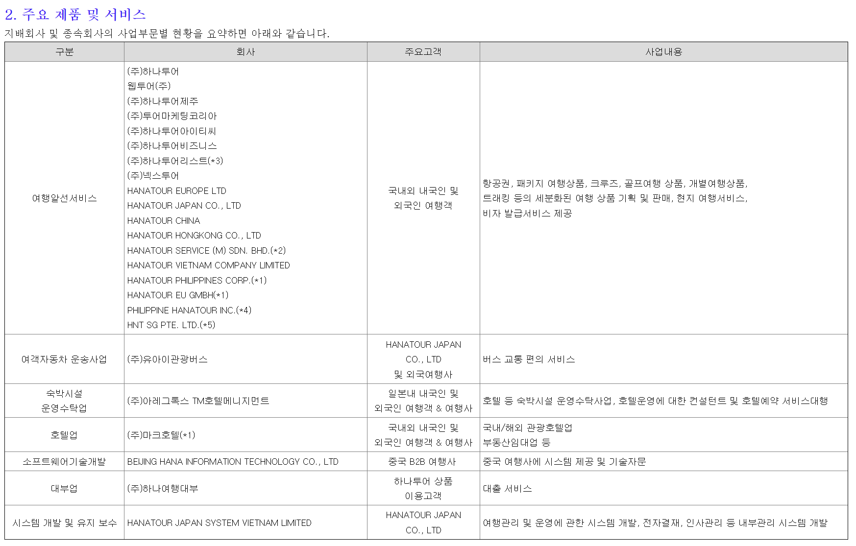 하나투어 주요 사업 내용들. DART에 사업부문별 상세 설명도 있다.