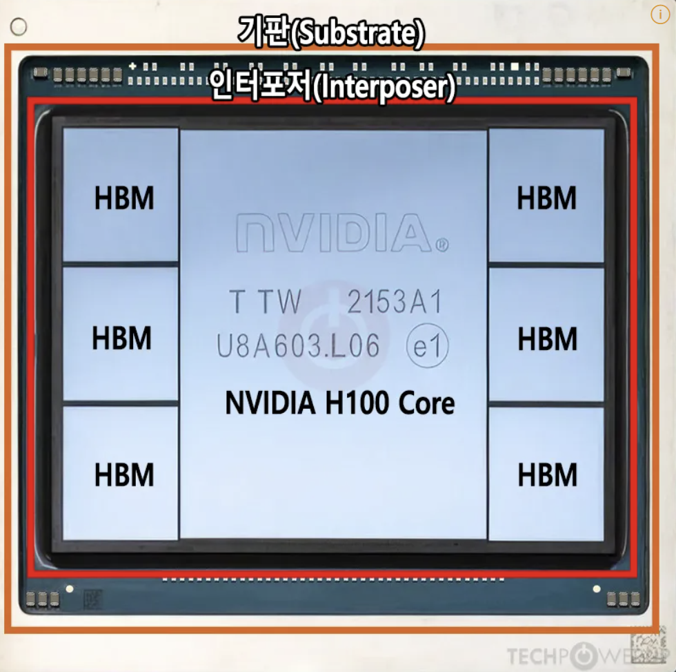 아무래도 대역폭이 크고 GPU와 밀접하게 작동해야 하기 때문에 기판에 각각 배치하는 것보다 인터포저를 통해 연결하는 것이 유리한 것이다.