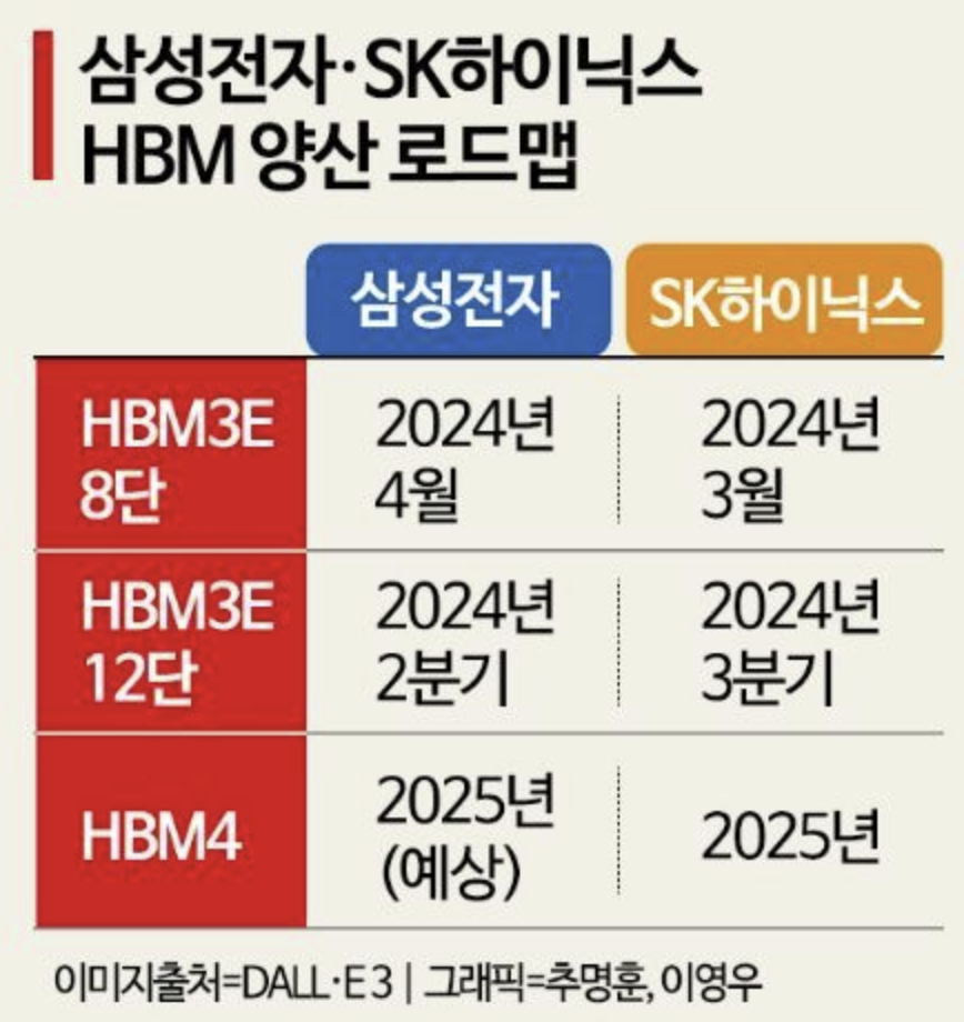 SK하이닉스가 5세대 고대역폭메모리(HBM3E) 12단 제품 양산 시기를 올해 3분기로 앞당긴다고 공식적으로 밝히면서 HBM 전쟁에 불을 붙였다는 분석이 나온다. 외신에선 SK하이닉스가 삼성전자를 앞서