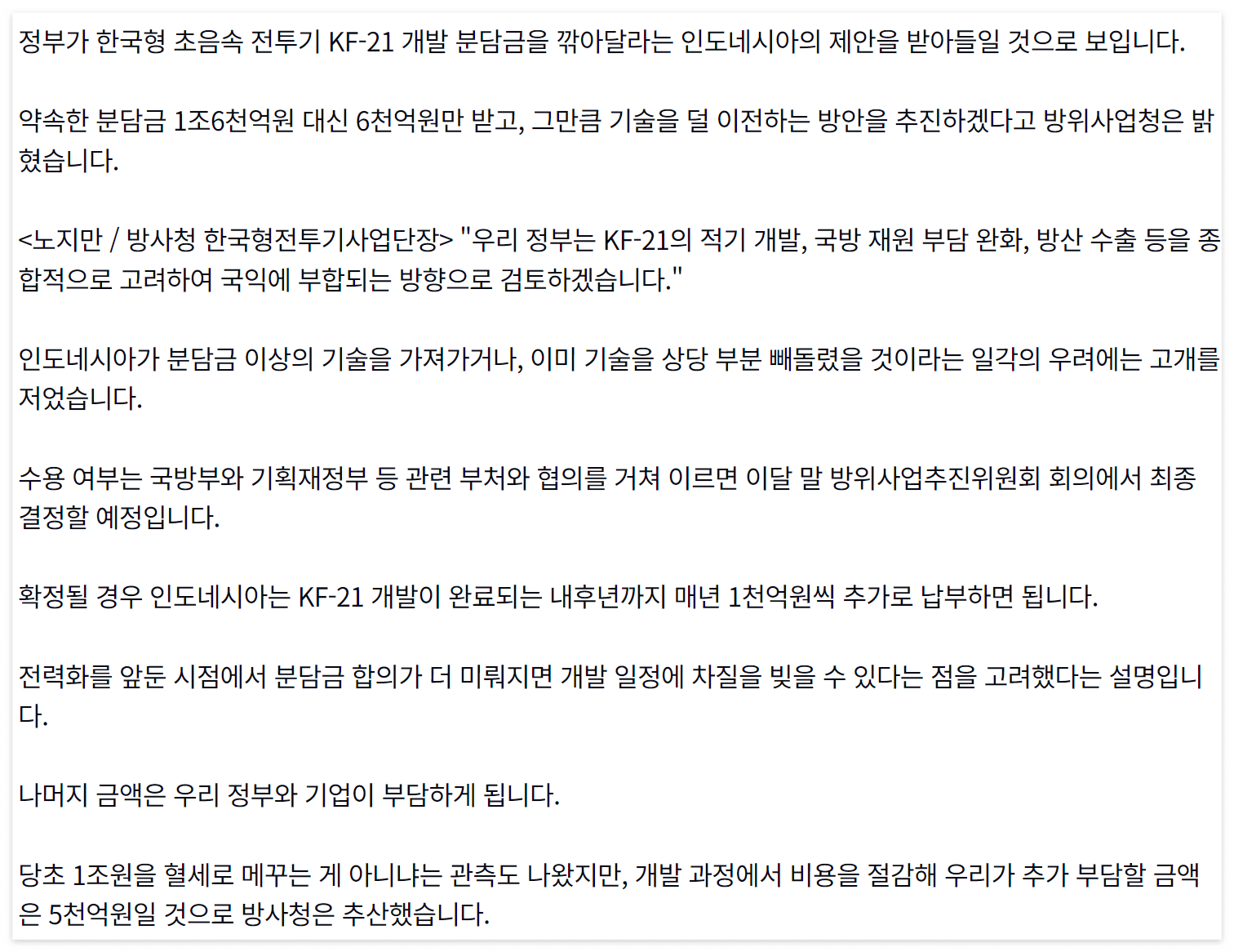 인도네시아의 땡깡으로 인해 KF-21은 개발비용 측면에서 부담이 커지게 되었지만,